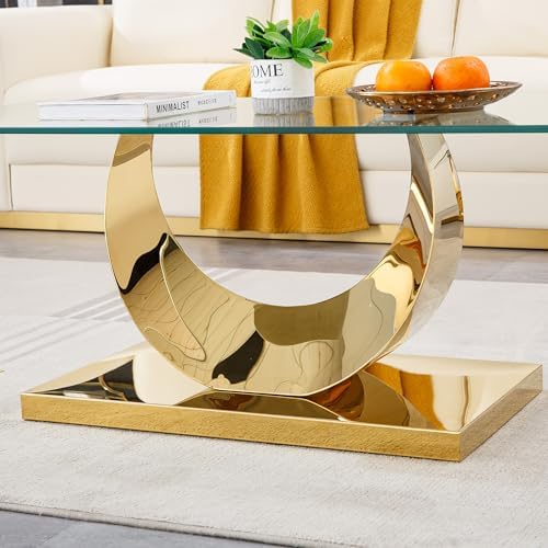 Home Shop Storage & Functional Luxury Gold Glass Coffee Table Rectangular Clear Glass Top, Mirrored Base